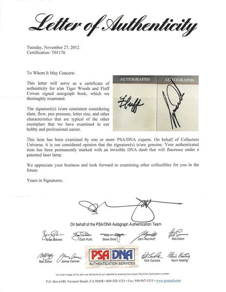 This Autographed Phoenix Open Autograph Book has been Personally Signed by Tiger Woods & Mike "Fluff" Cowan. This item is 100% Authentic and comes with a PSA/DNA Certification Card and a matching numbered Hologram. The authenticity can be verified on Professional Sports Authenticator website.