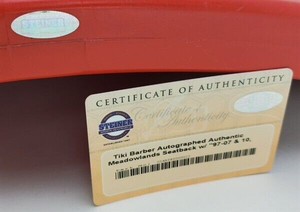 This autographed Seatback has been personally hand-signed by Tiki Barber of the New York Giants. When signing Barber inscribed "97-07, and 10,449 Yds" along with his signature. This autograph is certified by Steiner Sports. It comes with the Steiner Sports authentication hologram and Certificate of Authenticity. Due to the size of this item, shipping cost will be $30.