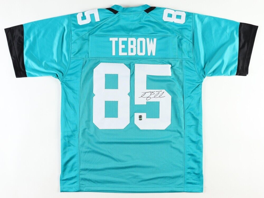 Custom on-field style jersey. Everything is sewn on, size XL. Hand-signed by Tim Tebow.The lot / autograph(s) includes an official Tim Tebow player hologram for authenticity purposes.Authentication: Tebow Hologram