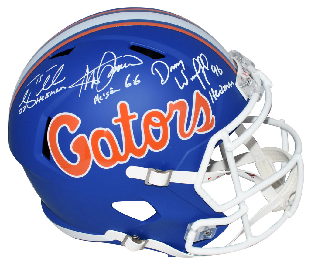 Tim Tebow, Steve Spurrier and Danny Wuerffel, the 3 Heisman Trophy winners for the Gators, have each hand signed this Florida Riddell Speed full-size replica helmet at a private signing. Each player included his Heisman inscription. This item is authenticated by Beckett Authentication Services and was signed in the presence of one of their representatives. Their tamper-evident hologram featuring a QR code and serial number is on the item. The authenticity can be verified online by entering the serial number or scanning the QR code.Item pictured may not be the exact item you will receive. It will be similar quality, and we guarantee your satisfaction.