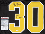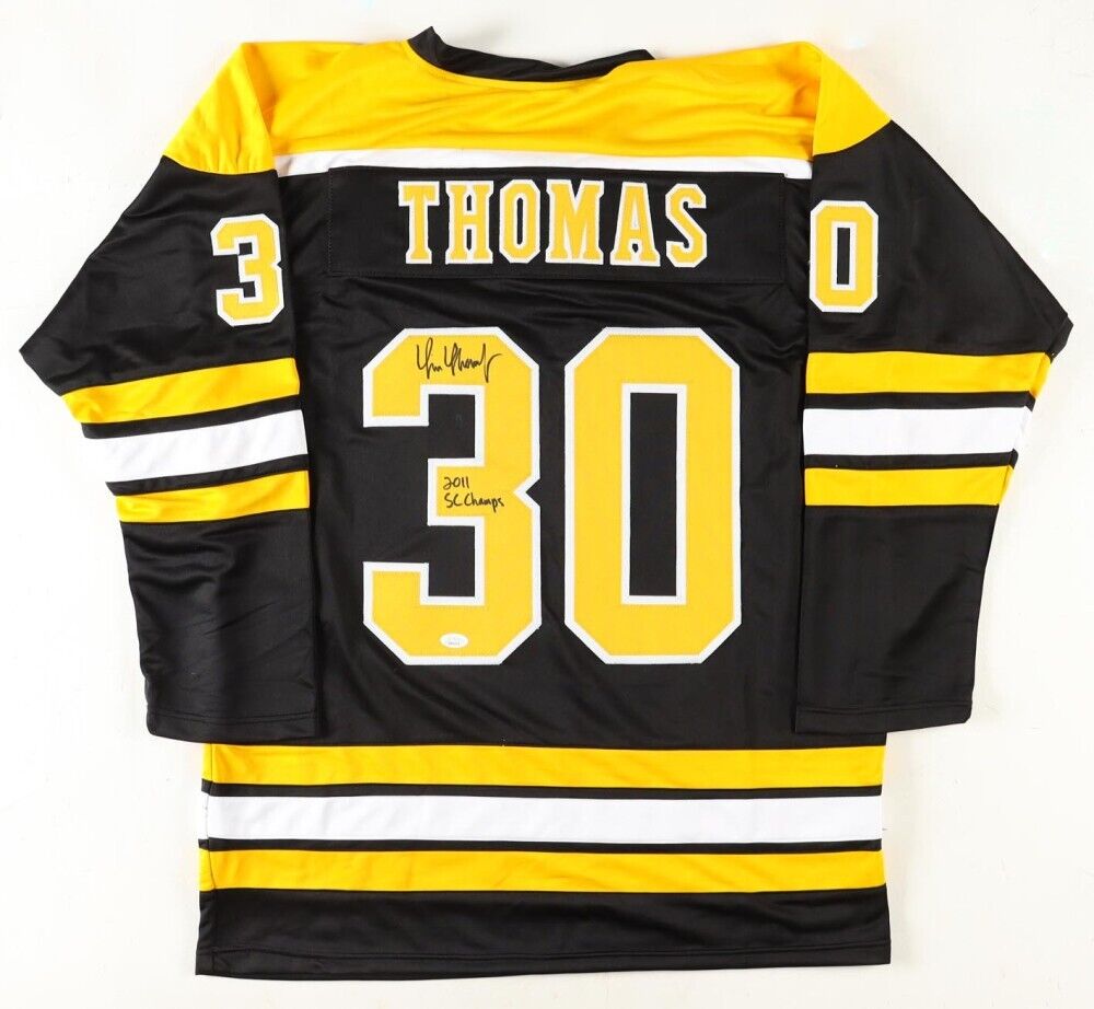 Custom on-ice style jersey. Everything is sewn on, size XL. Hand-signed and inscribed by Tim Thomas.The autograph includes an official James Spence Authentication (JSA) hologram and matching COA for authenticity purposes. The signing of this item was witnessed by JSA.Authentication: JSA COA