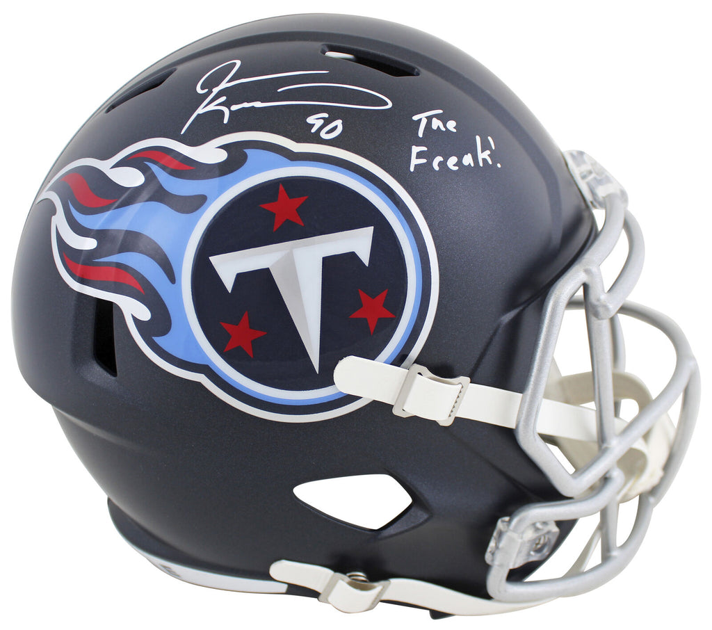 This Autographed w/ White SIgnature Navy Full Size Speed Rep Helmet with the inscription of "The Freak" has been Personally Signed by Jevon Kearse of the Tennessee Titans. This item is 100% Authentic to include a hologram by Beckett Authentication Services. This item will come with the new Beckett Authentication hologram that has a scannable QR code rather than the traditional COA. If you would like to have a COA, you are welcome to reach out to Beckett for a printed certification once you receive your item. This is a BAS Witnessed Protection Program item which means a Beckett Authentication Service representative was present when this item was being signed. We conducted an autograph signing with Jevon Kearse where multiples of the same item were signed. While the photographs are representative of this item, the size, placement and strength of the signature may vary. Each item is hand signed, therefore, each autograph is unique. This item can be verified through BAS Witnessed.