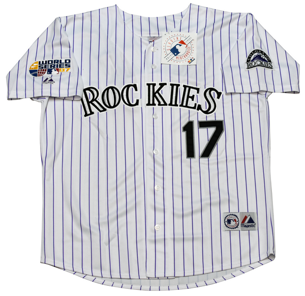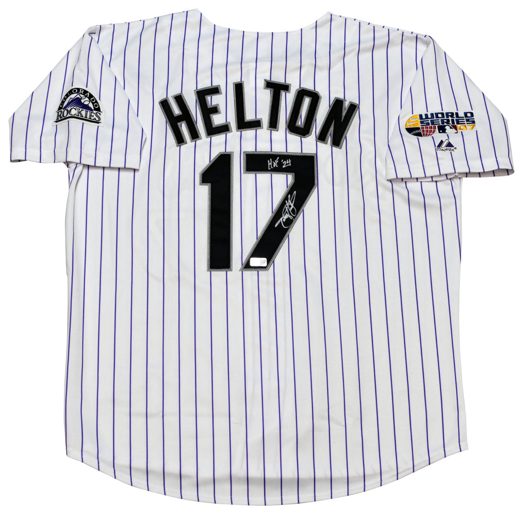Todd Helton, former Hall of Fame first baseman for the Colorado Rockies, has hand signed this white Majestic jersey with the 2007 World Series patch. He included the inscription "HOF 24" with his signature. Jersey is new with tags attached and everything is sewn-on. This item comes with a serial-numbered hologram from Tristar, one of the leaders in the industry. The authenticity can be verified online by entering the serial number. A Tristar information card is also included.Item pictured may not be the exact item you will receive. It will be similar quality, and we guarantee your satisfaction.
