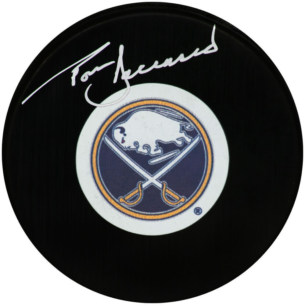 Tom Barrasso signed Buffalo Sabres logo hockey puck. Item comes with a Schwartz Sports Memorabilia tamper-proof numbered hologram and Certificate of Authenticity which can be verified online.