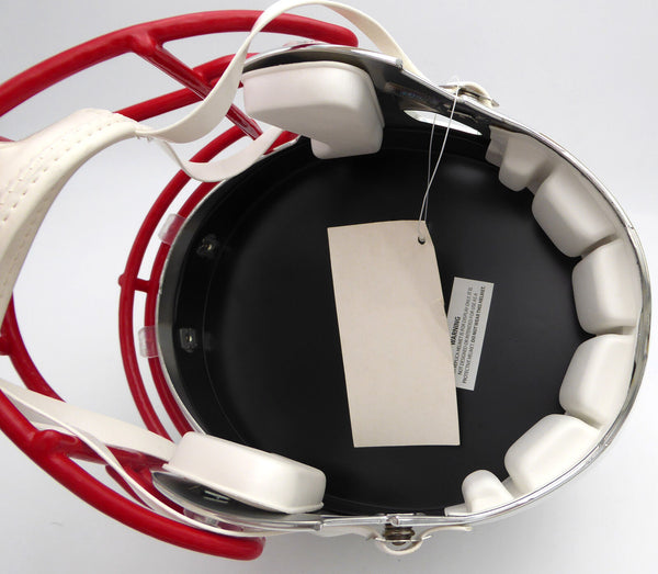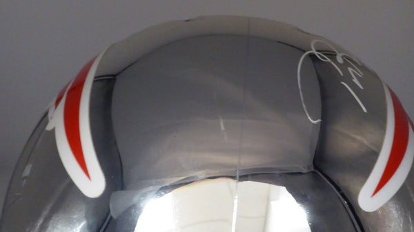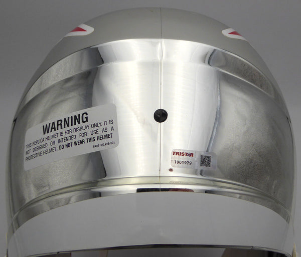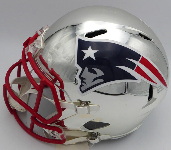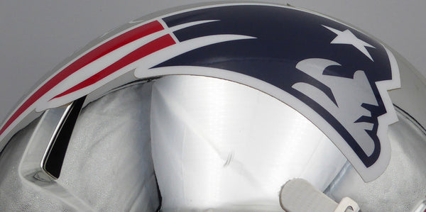 This is a Chrome Silver Full Size Replica Helmet that has been hand signed by Tom Brady. There are marks on the item as shown. This item has been certified authentic by TriStar and comes with their tamper-proof sticker and matching certificate of authenticity.