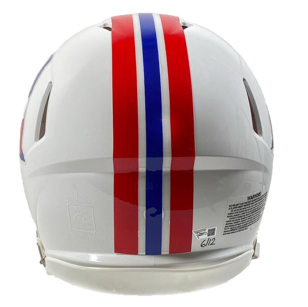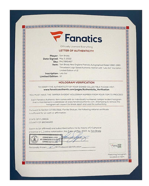 This authentic new england patriots throwback helmet has been personally hand-signed by tom brady with the inscription "lets go." also included is a custom visor that makes this piece stand out in any collection. it is officially licensed by the national football league and comes with an individually numbered, tamper-evident hologram from fanatics authentic. to ensure authenticity, the hologram can be reviewed online. this process helps to ensure that the product purchased is authentic and eliminates any possibility of duplication or fraud.this helmet is limited to just 12 and the winning bidder will receive a random number from the edition.