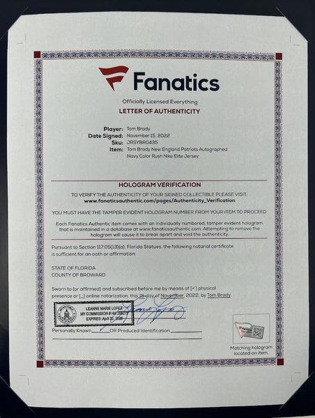 This new england patriots nike navy blue elite jersey has been personally hand-signed by tom brady. it is officially licensed by the national football league and comes with an individually numbered, tamper-evident hologram from fanatics authentic. to ensure authenticity, the hologram can be reviewed online. this process helps to ensure that the product purchased is authentic and eliminates any possibility of duplication or fraud.