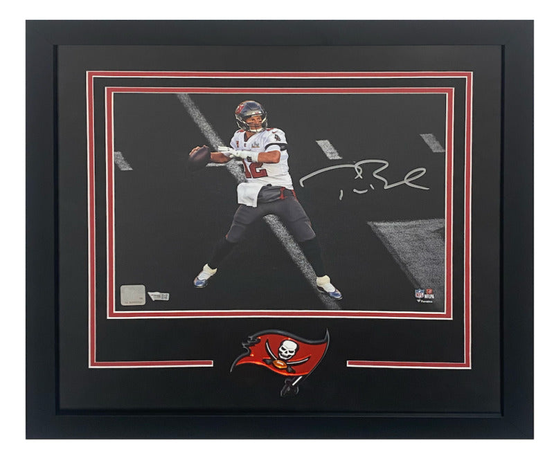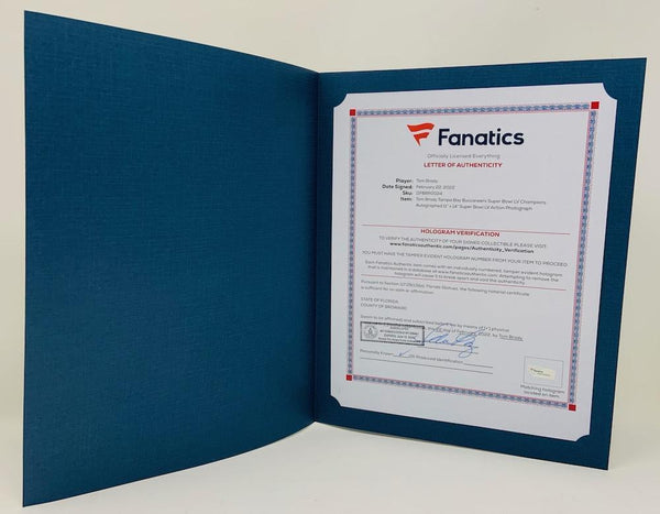 This custom framed 11" x 14" photograph has been personally hand signed by Tom Brady. This photograph is beautifully framed with museum quality materials and an acrylic team logo. It is officially licensed by the National Football League and comes with an individually numbered, tamper evident hologram from Fanatics Authentic. To ensure authenticity, the hologram can be reviewed online. This process helps to ensure that the product purchased is authentic and eliminates any possibility of duplication or fraud.