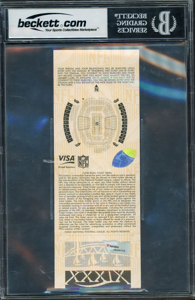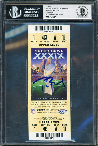 This is a Super Bowl XXXIX Full Ticket, approximately 2.5x7, that has been hand signed by Tom Brady. The condition of the signature was graded a Gem Mint 10 by Beckett BAS. It has been certified authentic by Beckett Authentication Services (BAS) and comes encapsulated in their tamper-proof holder.