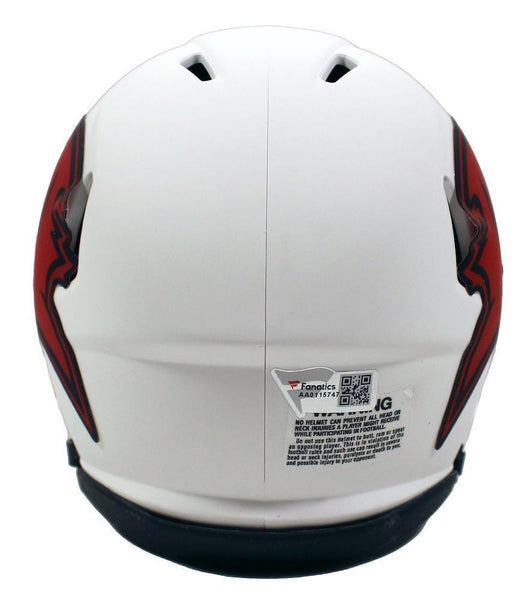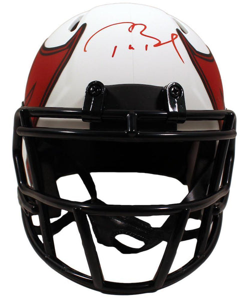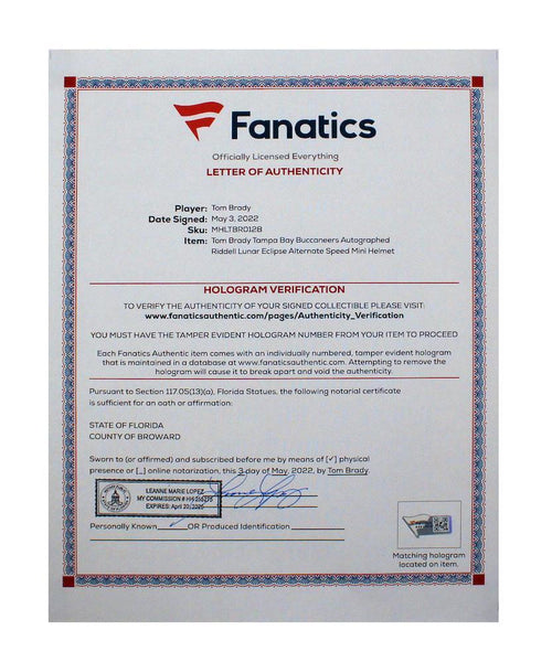 This Tampa Bay Buccaneers Lunar Eclipse mini speed helmet has been personally hand-signed by Tom Brady. It is officially licensed by the National Football League and comes with an individually numbered, tamper-evident hologram from Fanatics Authentic. To ensure authenticity, the hologram can be reviewed online. This process helps to ensure that the product purchased is authentic and eliminates any possibility of duplication or fraud.