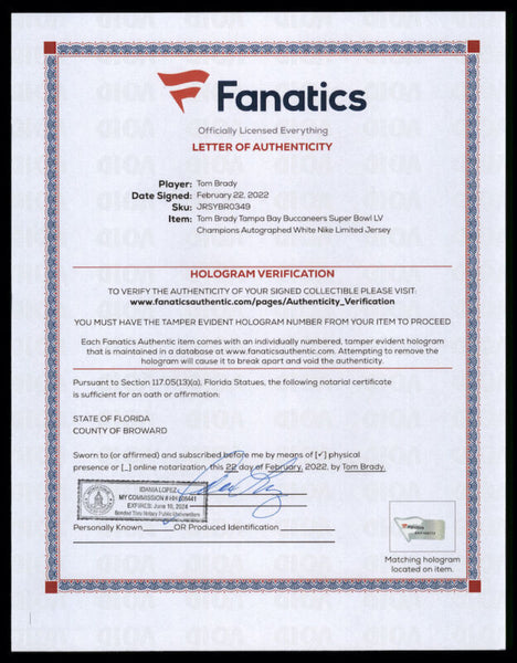 This Nike Limited jersey has been personally hand-signed by Tom Brady. It is officially licensed by the National Football League and comes with an individually numbered, tamper-evident hologram from Fanatics Authentic. To ensure authenticity, the hologram can be reviewed online. This process helps to ensure that the product purchased is authentic and eliminates any possibility of duplication or fraud.