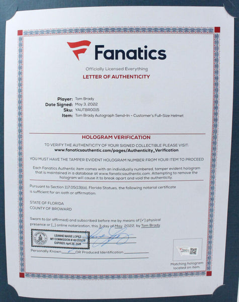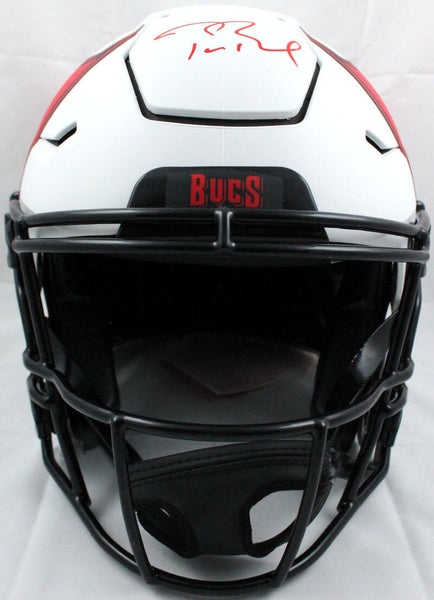 Tom Brady Signed Tampa Bay Buccaneers F/S Lunar SpeedFlex Helmet- Fanatics/LOA This is a Tom Brady of the Tampa Bay Buccaneers hand autographed Riddell Full Size Lunar SpeedFlex Authentic Helmet. This item has a Fanatics Authentication, which comes with a numbered sticker hologram and a QR code for verification. You can view this item on the Fanatics website. It was signed either at a public autograph appearance or a private signing. This is a stock photo of the item. Although you may not receive this exact item, the item you receive is virtually identical, brand new, and in great shape.
