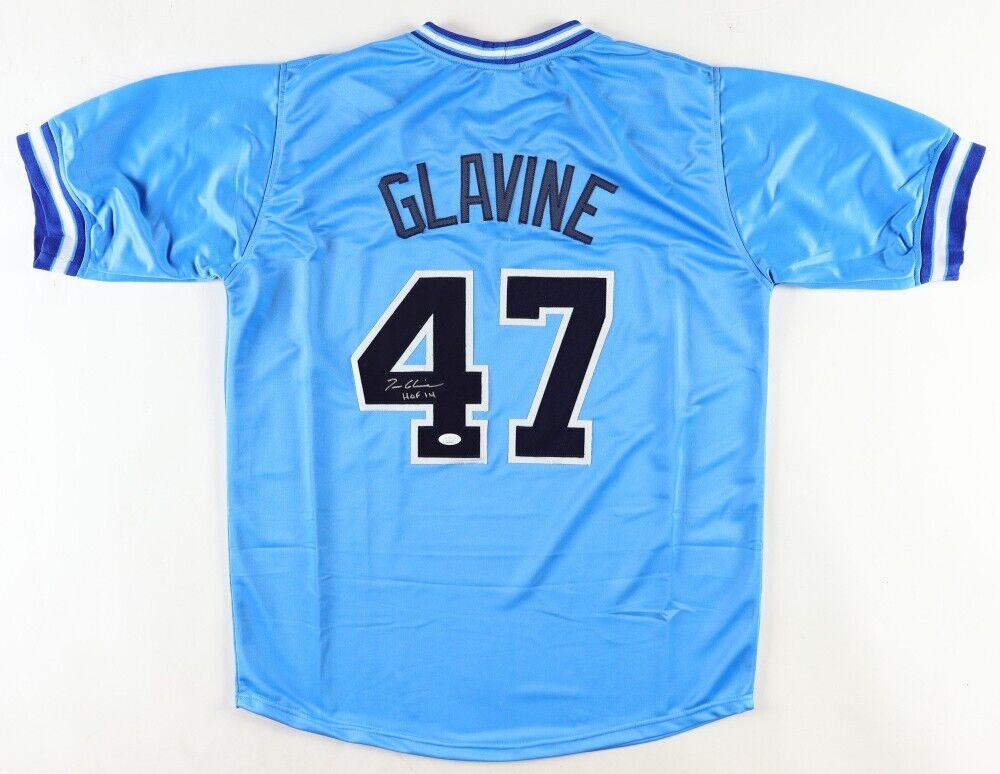 Custom on-field style jersey. Everything is sewn on, size XL. Hand-signed in silver paint pen by Tom Glavine (HOF). The lot / autograph(s) includes an official James Spence Authentication (JSA) hologram and matching COA for authenticity purposes. The signing of this item was witnessed by JSA.Authentication: JSA COA