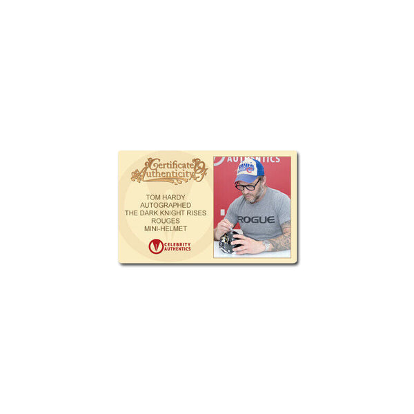 Celebrity Authentics is the exclusive autograph partner of Tom Hardy. Please be aware most other online autographs purported to be Mr. Hardy's are forgeries. Mr. Hardy has only signed with Celebrity Authentics so be sure the item you choose is affixed with the Celebrity Authentics Authentication Hologram for his genuine signature.This The Dark Knight Rises Gotham Rouges Mini-Helmet (with metal facemark) has been personally hand-signed by Bane himself, Tom Hardy during his exclusive signing with Celebrity Authentics. It has been eight years since Batman (Christian Bale), in collusion with Commissioner Gordon (Gary Oldman), vanished into the night. Assuming responsibility for the death of Harvey Dent, Batman sacrificed everything for what he and Gordon hoped would be the greater good. However, the arrival of a cunning cat burglar (Anne Hathaway) and a merciless terrorist named Bane (Tom Hardy) force Batman out of exile and into a battle he may not be able to win. Ships with acrylic display case and is affixed with the Celebrity Authentics serial-numbered and tamper evident Authentication Hologram and includes Celebrity Authentics Certificates of Authenticity featuring picture of Tom signing helmet. Rare and unique piece from this classic Batman film.Please note: with multiples signed by the actor, a sample photo is used from stock to represent what you will receive. Exact autograph size and placement may vary.
