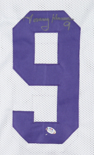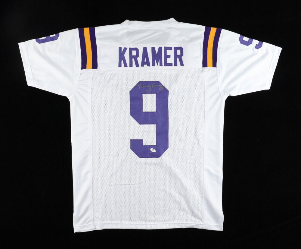Custom on-field style jersey. Everything is sewn on, size XL. Hand-signed in silver felt tip pen by Tommy Kramer. The lot / autograph(s) includes an official James Spence Authentication (JSA) hologram for authenticity purposes. The signing of this item was witnessed by JSA.Authentication: JSA Hologram