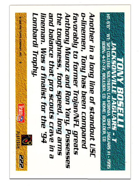 Tony Boselli signed Jacksonville Jaguars 1995 Topps rookie football trading card #222. Item comes with a Schwartz Sports Memorabilia tamper-proof numbered hologram (on back of physical card) and Certificate of Authenticity which can be verified online.