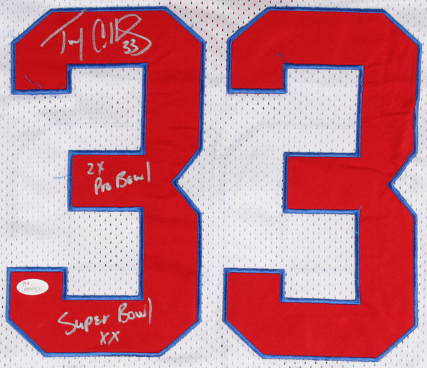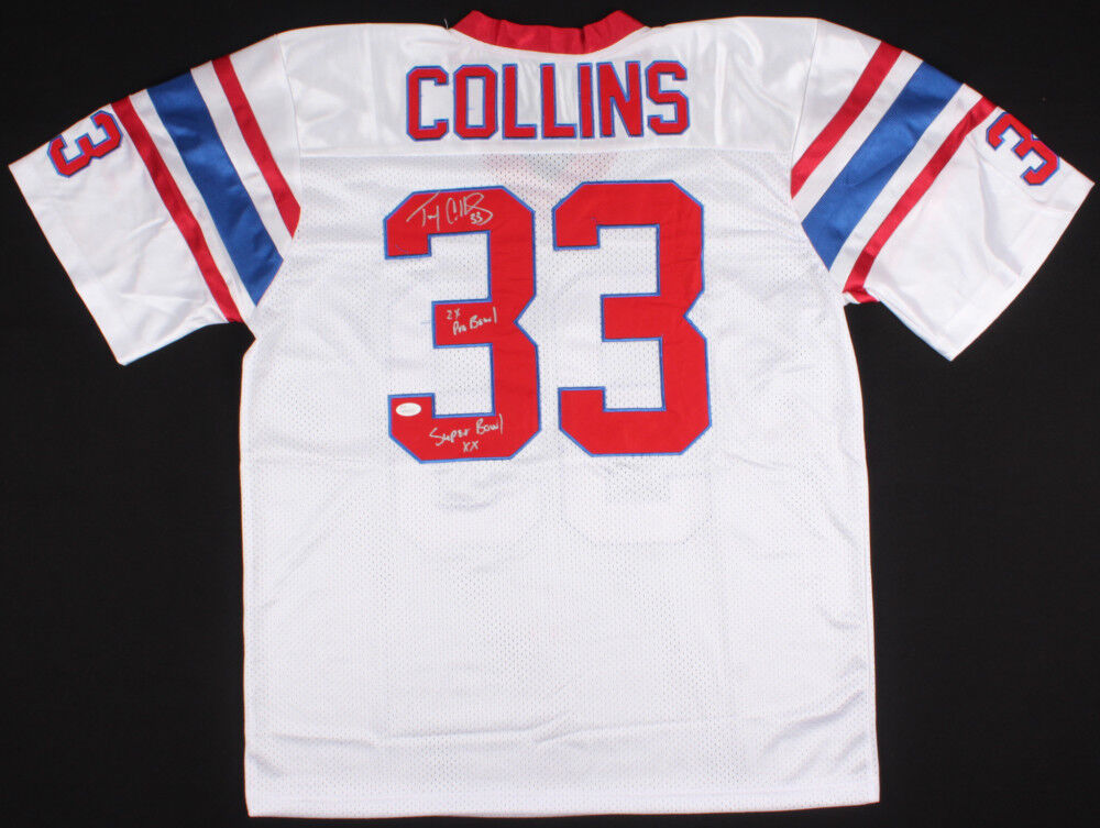 Custom on-field style jersey. Everything is sewn on, size XL. Hand-signed and inscribed in silver paint pen by Tony Collins. The lot / autograph(s) includes an official James Spence Authentication (JSA) hologram and matching COA for authenticity purposes. The signing of this item was witnessed by JSA.Authentication: JSA COA