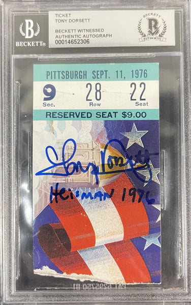 Tony Dorsett Signed Pittsburgh Panthers Ticket 9/11/76 vs ND BAS Slab 39470 The number in the listing title is just an inventory sku for our records and is not the authentication number. The item pictured is a stock photo unless otherwise noted. This is a Dallas Cowboys vs. Carolina Panthers ticket stub that was personally autographed by Tony Dorsett. This has been professionally slabbed by Beckett Authentication Services (BAS) and includes a certificate of authenticity from Denver Autographs.