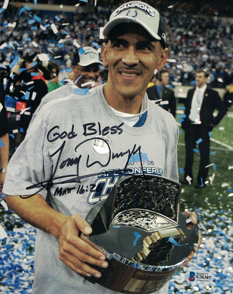 Tony Dungy Autographed/Signed Indianapolis Colts 8x10 Photo BAS 29760 The number in the listing title is just an inventory sku for our records and is not the authentication number. This is an 8x10 photo that was personally autographed by Tony Dungy. Includes a certificate of authenticity from Beckett Authentication Services (BAS) and Denver Autographs.
