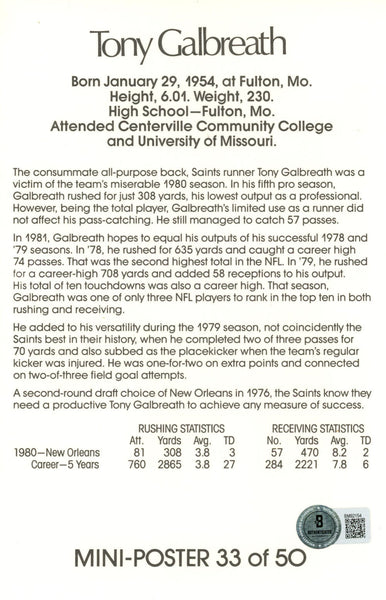The number in the listing title is just an inventory sku for our records and is not the authentication number. This is a stock photo of the item that you will receive. This is a mini poster measuring 8.5" x 5.5" that was personally autographed by Tony Galbreath. Includes a certificate of authenticity from Beckett Authentication Services (BAS) and Denver Autographs.FREE SHIPPING within the USA on orders over $10!