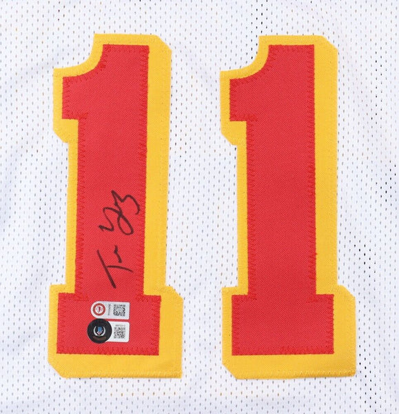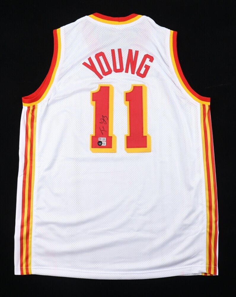 Custom on-court style jersey. Everything is sewn on, size adult XL. Hand-signed by Trae Young. Please note, there are red stains on the back of the jersey (see photos).The autograph includes an official Beckett Authentication Services serially numbered hologram for authenticity purposes. The signing of this item was witnessed by Beckett.Authentication: Beckett HologramThe lot / autograph(s) includes an official USA Sports Marketing Trae Young hologram and COA for authenticity purposes.Authentication: Young COA Shop our ebay store / Friendly Confines Collectibles for thousands of different autographed jerseys