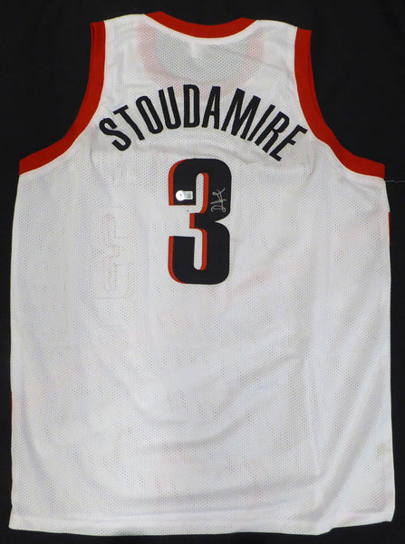 This is a White Jersey that has been hand signed by Damon Stoudamire. This is a custom jersey with no name brand. The approximate size is XL. It has nice sewn in name and numbers. This item has been certified authentic by Beckett Authentication (BAS) and comes with their tamper-proof QR Code sticker that can be verified on the Beckett-authentication.com.