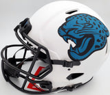 This is a Jacksonville Jaguars Lunar Eclipse White Full Size Authentic Speed Helmet that has been hand signed by Travis Etienne. The Eclipse helmets are very delicate and often have some marks or scratches on them. This item has been certified authentic by Beckett Authentication (BAS) and comes with their tamper-proof QR Code sticker that can be verified on the Beckett-authentication.com.
