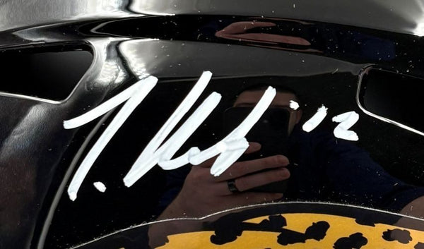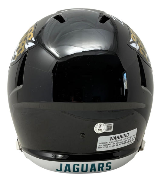 Featured is a Travis Hunter signed Jacksonville Jaguars full size speed replica helmet. This helmet has been hand signed by Hunter and comes with the Beckett hologram and certificate of authenticity. Included with this helmet is a deluxe acrylic display case. This helmet would make a great addition to any sports memorabilia collection! SPECIFICATIONS Autographed By: Travis Hunter Team: Jacksonville Jaguars Sport: Football Authentication: Beckett