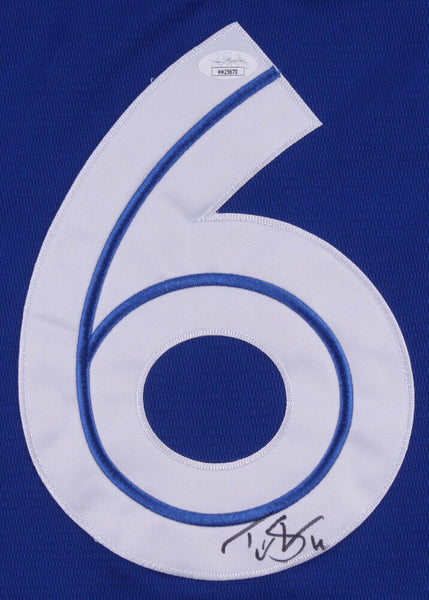 Majestic on-field style jersey. Everything sewn on, size L or XL. Hand-signed in black felt-tip pen by Travis Shaw (Toronto Blue Jays). The lot / autograph(s) includes an official James Spence Authentication (JSA) hologram and matching COA for authenticity purposes.Authentication: JSA COA