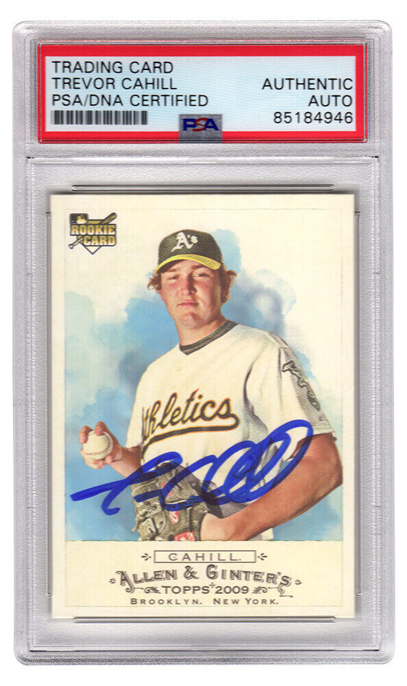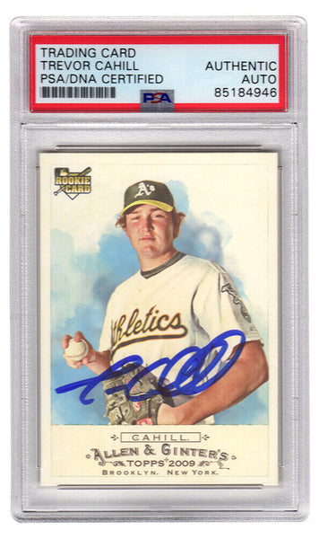Trevor Cahill signed Oakland A's 2009 Topps Allen & Ginter rookie baseball trading card #241. The card has been authenticated and encapsulated by PSA/DNA and the number can be verified online.