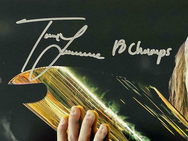 This 11" x 14" photograph has been personally hand-signed by Trevor Lawrence with the inscription "18 CHAMPS." It is officially licensed by the NCAA and comes with an individually numbered, tamper-evident hologram from Fanatics Authentic. To ensure authenticity, the hologram can be reviewed online. This process helps to ensure that the product purchased is authentic and eliminates any possibility of duplication or fraud.