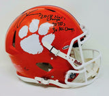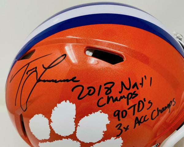 This full size authentic speed helmet has been personally hand-signed by Trevor Lawrence with the inscriptions "2018 Nat'l Champs 90 TD's 3x ACC Champs." It is officially licensed by the NCAA and comes with an individually numbered, tamper-evident hologram from Fanatics Authentic. To ensure authenticity, the hologram can be reviewed online. This process helps to ensure that the product purchased is authentic and eliminates any possibility of duplication or fraud.This helmet is limited to just 16 and you are bidding on a random number from that edition.