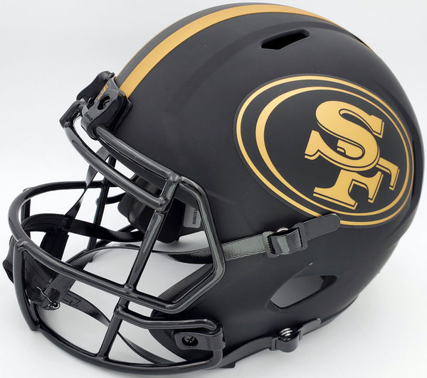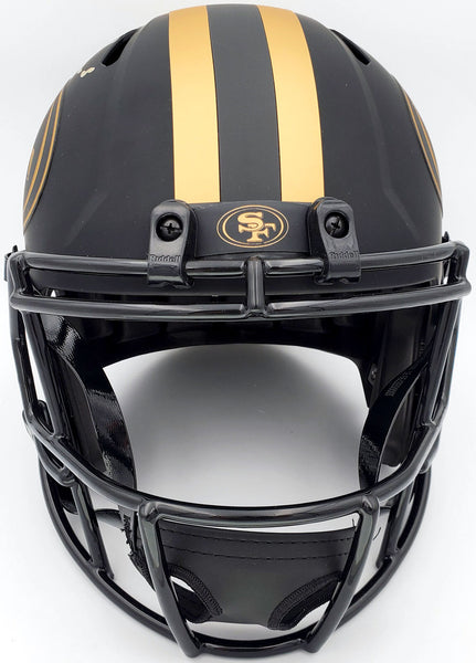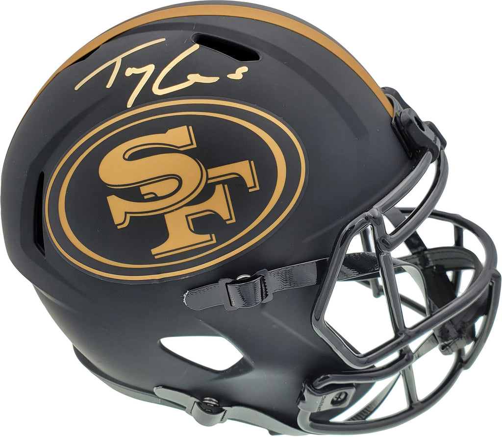 This is a San Francisco 49ers Eclipse Black Full Size Replica Speed Helmet that has been hand signed by Trey Lance. The Eclipse helmets are very delicate and often have some marks or scratches on them. This item has been certified authentic by Beckett Authentication (BAS) and comes with their tamper-proof QR Code sticker that can be verified on the Beckett-authentication.com.