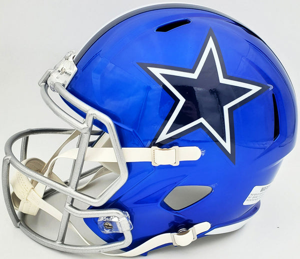 This is a Dallas Cowboys Flash Blue Full Size Replica Speed Helmet that has been hand signed by Troy Aikman. The Flash helmets are very delicate and often have some marks or scratches on them. This item has been certified authentic by Beckett Authentication (BAS) and comes with their tamper-proof QR Code sticker that can be verified on the Beckett-authentication.com.