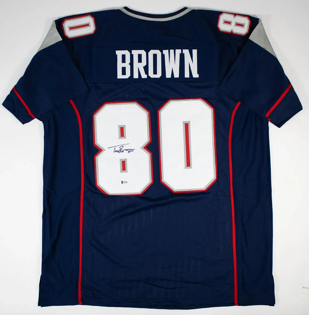 Custom on-field style jersey. Has been personally hand-signed by Troy Brown of the New England Patriots. This autograph is certified by Beckett Authentication Services (BAS). It comes with the numbered hologram and matching Certificate of Authenticity.Custom on-field style jerseys are a more affordable option for autograph seekers. These jerseys do not have any brand name or tags and are made in the Philippines. They feature stitched on names and numbers and are made to look very similar to the on-field jerseys that the players wear. These custom jerseys are very commonly used in the memorabilia industry.