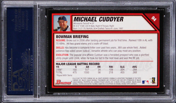 This Autographed 2007 Bowman #94 Card has been Personally Signed by Michael Cuddyer of the Minnesota Twins. This item is 100% Authentic, it comes slabbed and authenticated by PSA/DNA. The authenticity can be verified on Professional Sports Authenticator website.