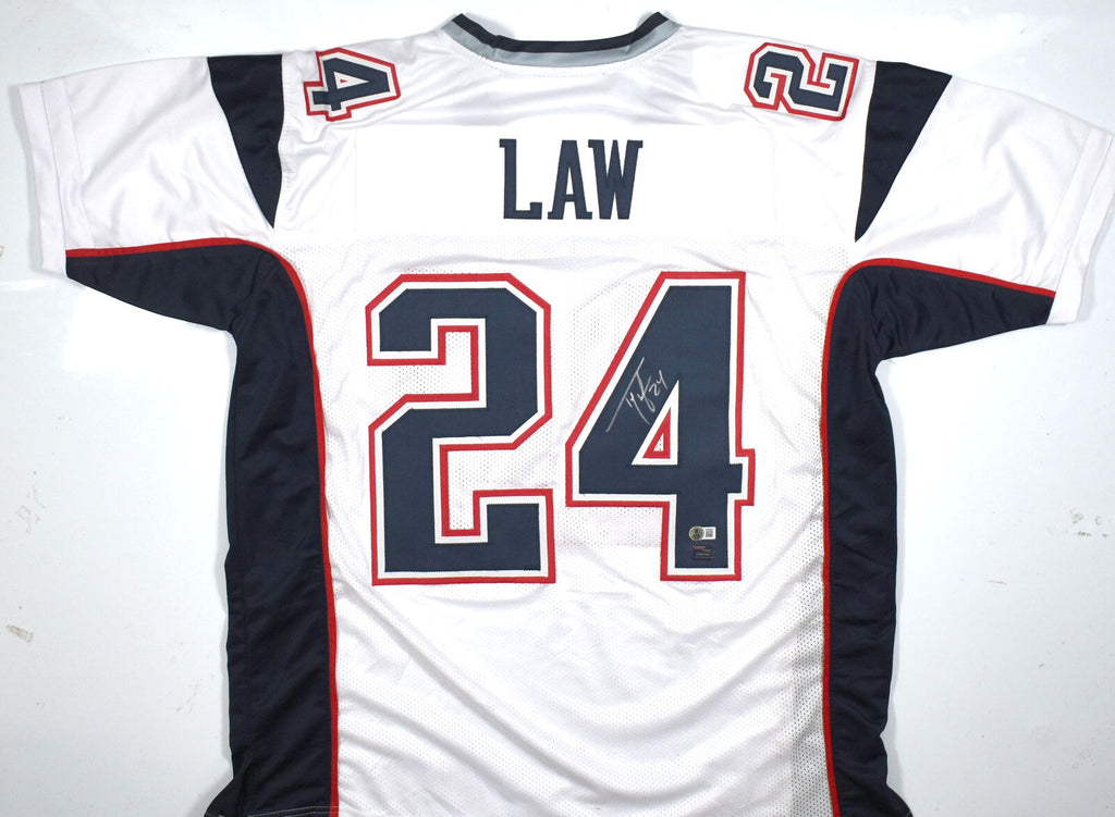 THIS IS NOT AN NFL JERSEY. THIS HAS NO TAGS, NO LOGOS, NO EMBLEMS. This is a hand autograph of Ty Law on a Custom Made (non name brand) Authentic Style Jersey with stitched letters and numbers. This item has a Beckett Witnessed Authentication, which comes with a numbered hologram and a QR code for verification. You can view this item on the Beckett Authentication website and it shows when and where the item was signed. It was signed either at a public autograph appearance or a private signing. This is a stock photo of the item. Although you may not receive this exact item, the item you receive is virtually identical and brand new in great shape. Jersey size is XL. THIS IS NOT AN NFL JERSEY. THIS HAS NO TAGS, NO LOGOS, NO EMBLEMS. This is a hand autograph of Ty Law on a Custom Made (non name brand) Authentic Style Jersey with stitched letters and numbers. This item has a Beckett Witnessed Authentication, which comes with a numbered hologram and a QR code for verification. You can view this item on the Beckett Authentication website and it shows when and where the item was signed. It was signed either at a public autograph appearance or a private signing. This is a stock photo of the item. Although you may not receive this exact item, the item you receive is virtually identical and brand new in great shape. Jersey size is XL.