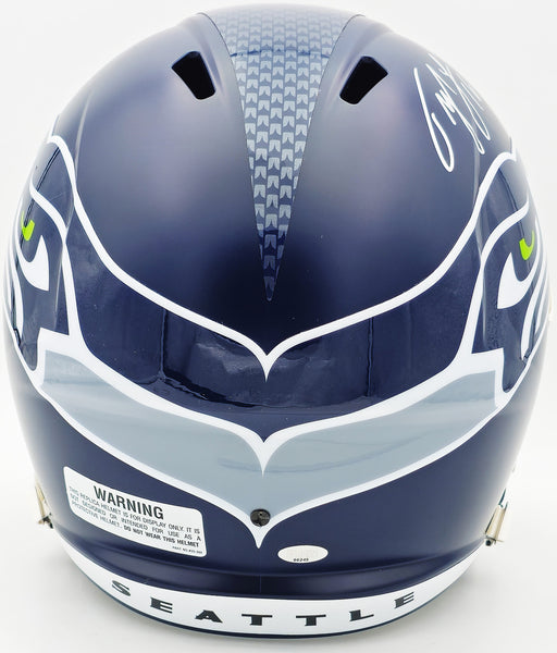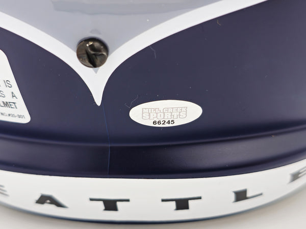 This is a Seattle Seahawks Blue Full Size Speed Replica Helmet that has been hand signed by Tyler Lockett. This item was signed in the presence of a Mill Creek Sports representative and comes with their serial numbered hologram and matching certificate of authenticity.