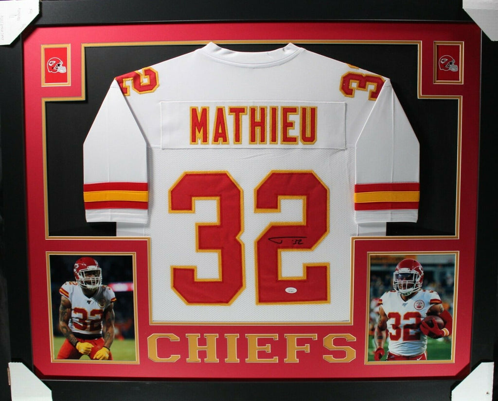 TYRANN MATHIEU AUTOGRAPHED & PROFESSIONALLY FRAMED PRO-STYLE JERSEY(Occasionally our own stock pictures are used at times due to quantity of framing, all frames will look identical as the one pictured)Item is accompanied with a Certificate of Authenticity issued by JSA and corresponding tamper proof hologram on the jersey.THE FRAMED JERSEY MEASURES 35"x 44" & COMES WITH THE FOLLOWING:-UV Protected Acrylic-Triple Acid Free Team Colored Matting-2 High Quality 8"x10" Photos-Team Logo