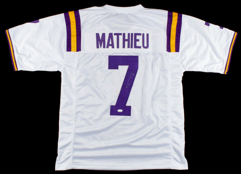 Custom on-field jersey. Everything is sewn on, size XL. Has been hand-signed by Tyrann Mathieu .The lot / autograph(s) includes an official James Spence Authentication (JSA) hologram and matching COA for authenticity purposes.Authentication: JSA COA