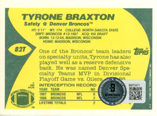 The number in the listing title is just an inventory sku for our records and is not the authentication number. This is the exact item that you will receive so please see pictures for condition. This is a trading card that was personally autographed by Tyrone Braxton. Includes a certificate of authenticity from Beckett Authentication Services (BAS) and Denver Autographs.