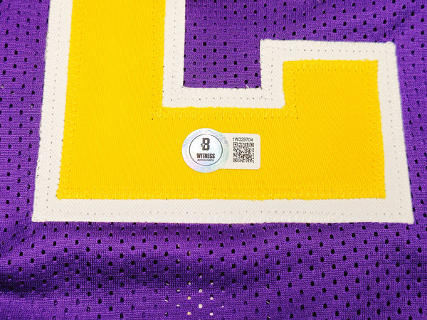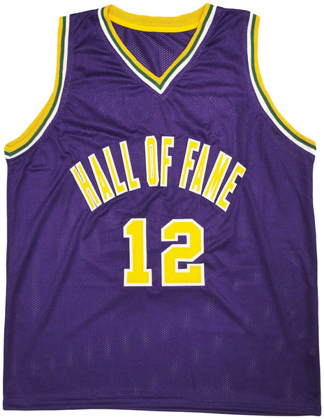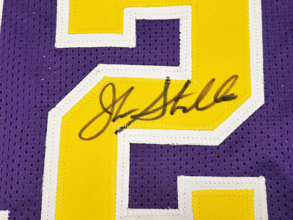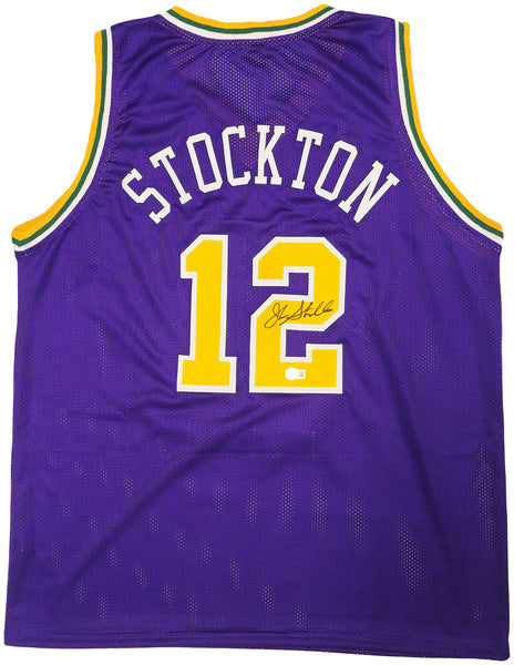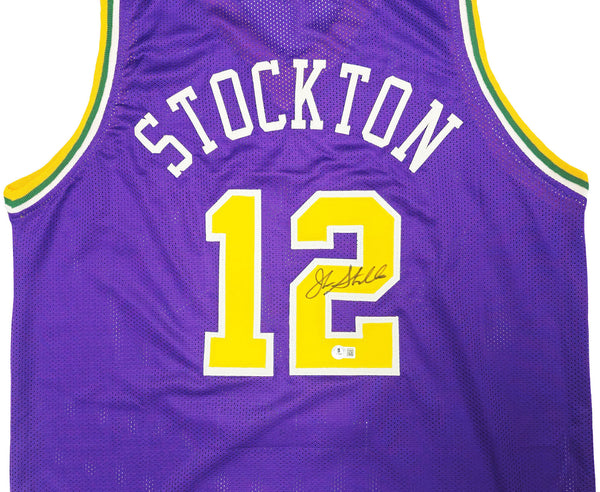 This is a Purple Jersey that has been hand signed by John Stockton. This is a custom jersey with no name brand. The approximate size is XL. It has nice sewn in name and numbers. This item has been witnessed and certified authentic by Beckett Authentication (BAS) and comes with their tamper-proof witness sticker.