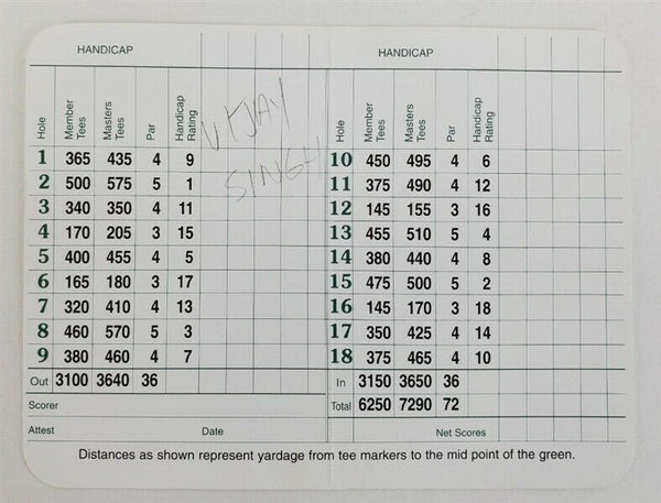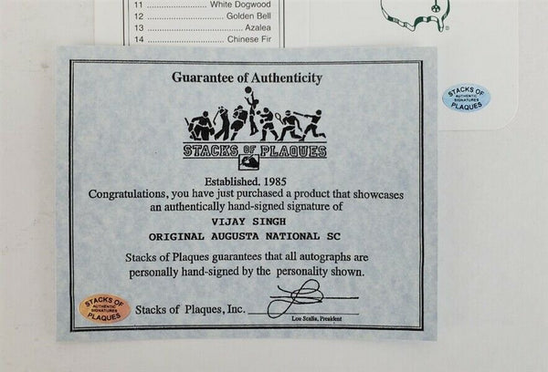 This autographed August National scorecard has been personally hand-signed by golf pro, Vijay Singh. This autograph is certified by Stacks of Plaques (SOP). It comes with the Stacks of Plaques authentication hologram and Certificate of Authenticity.Nicknamed "The Big Fijian", Vijay has won 34 events on the PGA Tour, including three major championships: one Masters title (2000) and two PGA Championshaips (1998, 2004). He was elected to the World Golf Hall of Fame in 2006.Singh held #1 in the Official Golf World ranking for 32 weeks in 2004 and 2005. Vijay was the 12th man to reach the world No. 1-ranking and was the only new world No. 1 in the 2000s decade. Singh was the leading PGA Tour money winner in 2003, 2004 and 2008. He also captured the Fed Ex Cup in 2008