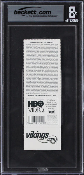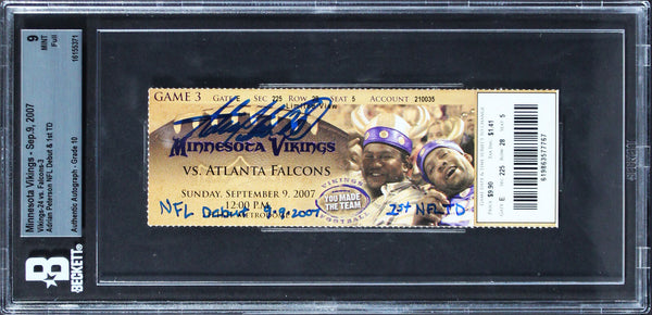 This Autographed Ticket Graded Mint 9, Auto Graded Gem Mint 10! September 9, 2007 Vikings Vs Falcons Full Ticket Stub with the inscription of "NFL Debut 9.9.2007 1st NFL TD" has been Personally Signed by Adrian Peterson of the Minnesota Vikings. This item is 100% Authentic, it comes slabbed and authenticated by Beckett Authentication Services. The authenticity can be verified on Beckett Authentication Services website.