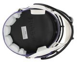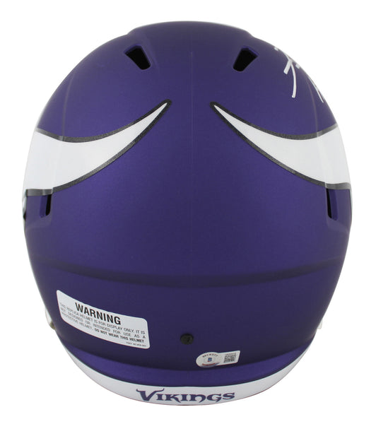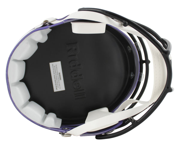 This Autographed Riddell Full Size Speed Rep Helmet with the inscription of "HOF 86" has been Personally Signed by Fran Tarkenton of the Minnesota Vikings. This item is 100% Authentic to include a hologram by Beckett Authentication Services. This item will come with an affixed Beckett Authentication Services (BAS) authentication sticker, which includes a scannable QR code to verify authenticity. Please note that Beckett no longer provides serial-numbered COA cards, and the attached BAS sticker will serve as the complete authentication for this item. This is a BAS Witnessed Protection Program item which means a Beckett Authentication Service representative was present when this item was being signed. We conducted an autograph signing with Fran Tarkenton where multiples of the same item were signed. While the photographs are representative of this item, the size, placement and strength of the signature may vary. Each item is hand signed, therefore, each autograph is unique. This item can be verified through BAS Witnessed.