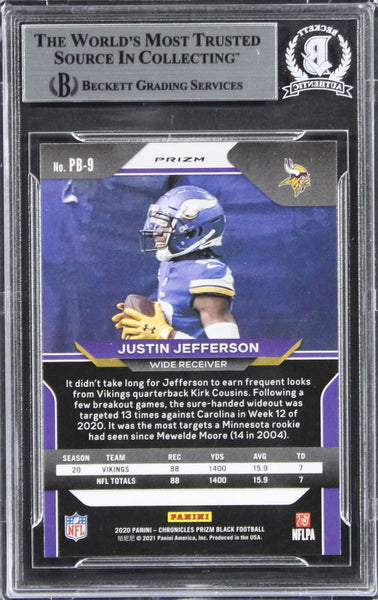 This Autographed 2020 Panini Prizm Black Silver #9 Rookie Card has been Personally Signed by Justin Jefferson of the Minnesota Vikings. This item is 100% Authentic, it comes slabbed and authenticated by Beckett Authentication Services. We conducted an autograph signing with Justin Jefferson where multiples of the same item were signed. While the photographs are representative of this item, the size, placement and strength of the signature may vary. Each item is hand signed, therefore, each autograph is unique. This item can be verified through BAS Slabbed.