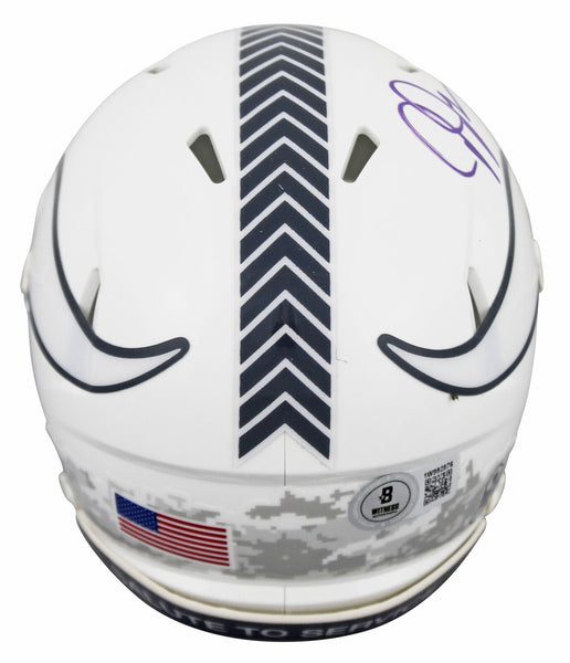 This Autographed Alternate 2024 Salute To Service III Speed Mini Helmet has been Personally Signed by Justin Jefferson of the Minnesota Vikings. This item is 100% Authentic to include a hologram by Beckett Authentication Services. This item will come with an affixed Beckett Authentication Services (BAS) authentication sticker, which includes a scannable QR code to verify authenticity. Please note that Beckett no longer provides serial-numbered COA cards, and the attached BAS sticker will serve as the complete authentication for this item. This is a BAS Witnessed Protection Program item which means a Beckett Authentication Service representative was present when this item was being signed. We conducted an autograph signing with Justin Jefferson where multiples of the same item were signed. While the photographs are representative of this item, the size, placement and strength of the signature may vary. Each item is hand signed, therefore, each autograph is unique. This item can be verified through BAS Witnessed.