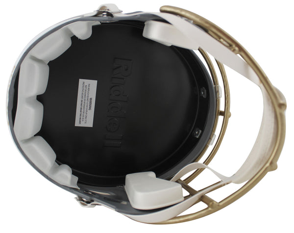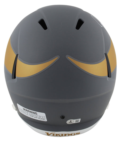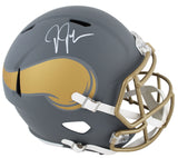 This Autographed Alternate Slate Riddell Full Size Speed Rep Helmet has been Personally Signed by Justin Jefferson of the Minnesota Vikings. This item is 100% Authentic to include a hologram by Beckett Authentication Services. This item will come with an affixed Beckett Authentication Services (BAS) authentication sticker, which includes a scannable QR code to verify authenticity. Please note that Beckett no longer provides serial-numbered COA cards, and the attached BAS sticker will serve as the complete authentication for this item. This is a BAS Witnessed Protection Program item which means a Beckett Authentication Service representative was present when this item was being signed. We conducted an autograph signing with Justin Jefferson where multiples of the same item were signed. While the photographs are representative of this item, the size, placement and strength of the signature may vary. Each item is hand signed, therefore, each autograph is unique. This item can be verified through BAS Witnessed.