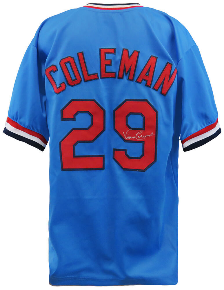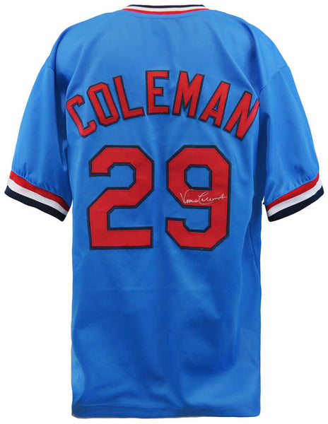 Vince Coleman signed blue throwback custom baseball jersey. Item comes with a Schwartz Sports Memorabilia tamper-proof numbered hologram and Certificate of Authenticity which can be verified online. Jersey is size XL.