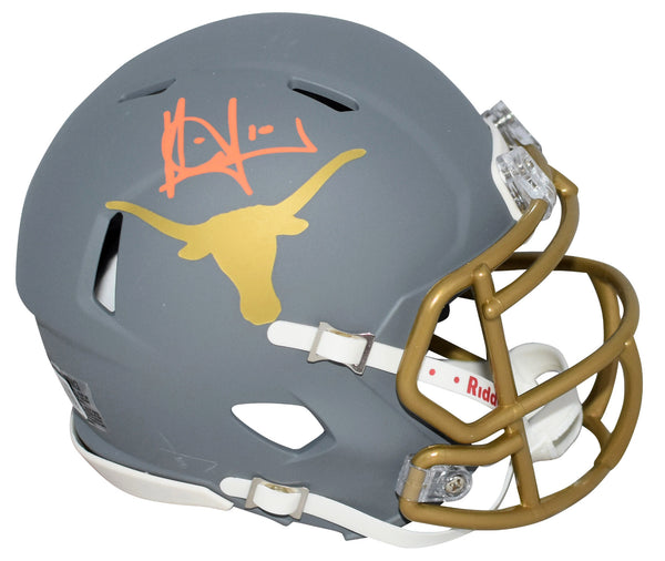 Vince Young, former All-American quarterback for the Longhorns, has hand signed this Texas Riddell Speed Slate mini helmet at a private signing. This item is authenticated by Beckett Authentication Services and was signed in the presence of one of their representatives. Their tamper-evident hologram featuring a QR code and serial number is on the item. The authenticity can be verified online by entering the serial number or scanning the QR code.Item pictured may not be the exact item you will receive. It will be similar quality, and we guarantee your satisfaction.